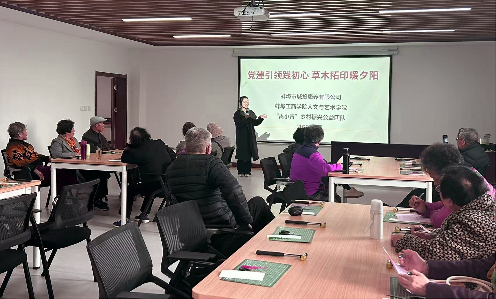 为深入践行党建引领,弘扬孝亲敬老传统,传承非遗文化,丰富老年群体精神文化生活,3月27日下午,我院组织师生党员志愿者,走进蚌埠市城投康养有限公司,开展“党建引领践初心,草木拓印暖夕阳”为主题的非遗手工活动。将春天装进书签,用指尖非遗传递青春温情,让夕阳岁月绽放别样光彩。